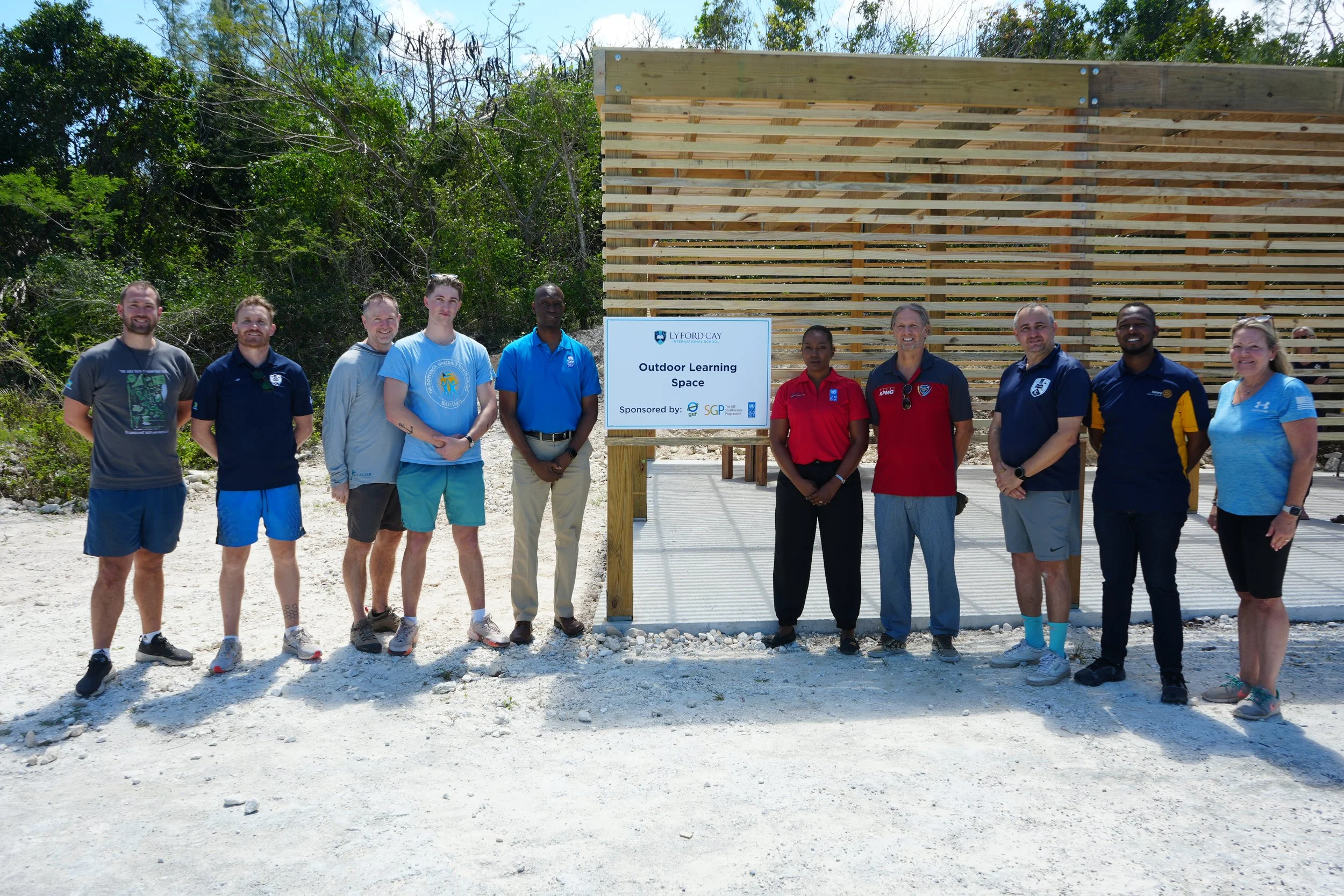 Brock Voss (Lower School Eco Club Advisor & Lower School Teacher); Joshua Purcell (Upper School Eco Club Advisor & Upper School Teacher); Chris Mindorff (David’s brother); Jonathan Mindorff (David’s son, LCIS Class of 2023); Deon Stewart (Senior National Coordinator for the UNDP GEF SGP); Dr Lesvie Archer (Senior Programme Assistant for UNDP GEF SGP); Audrius Barzdukas (Head of School), Frédéric Bournas (Head of Upper School), O’Niel Bain (Chief Operating Officer & Head of External Affairs), Viviane Proffitt (former Eco Club advisor)